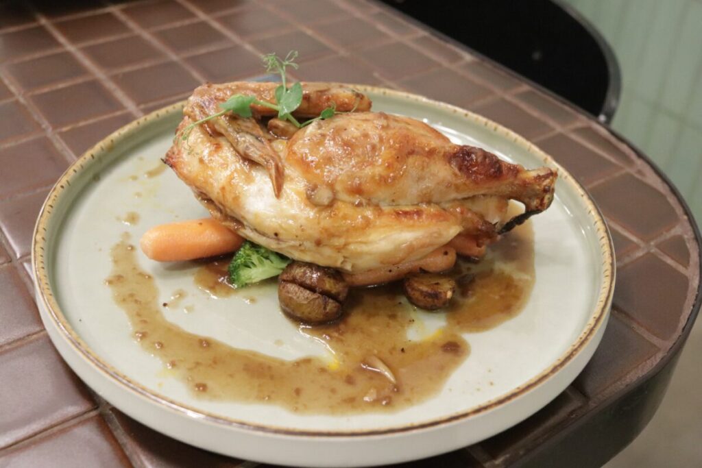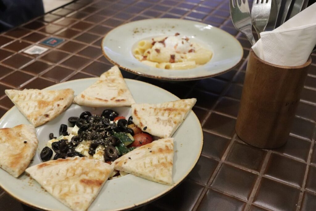グリークサラダとローストチキン、パスタを注文しました。